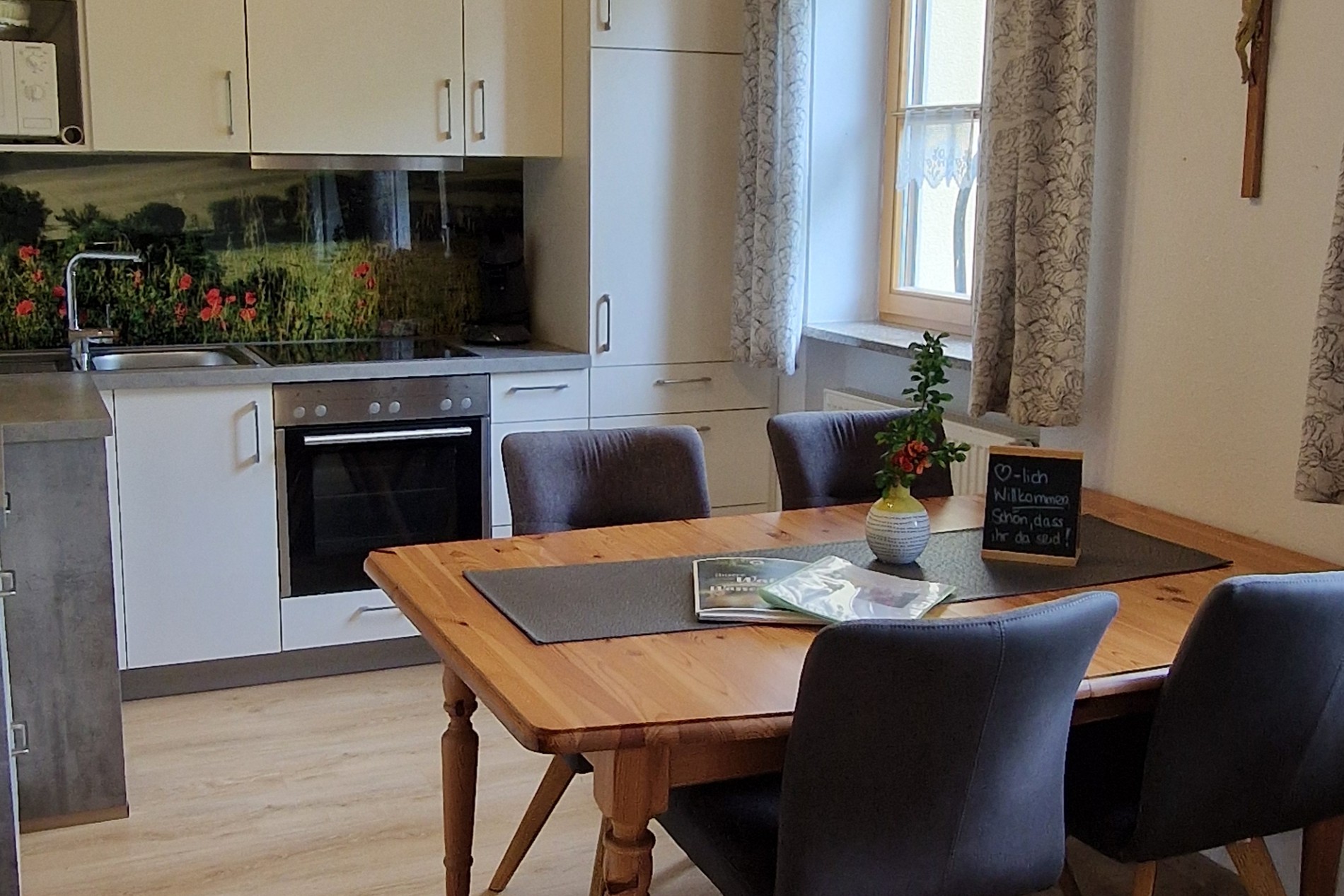 Im großen Wohnbereich finden Sie eine vollausgestattete Küche mit Geschirrspüler, Cerankochfeld, Backofen, Mikrowelle, Toaster, Kaffeemaschine (Senseo), usw. Geschirrspültabs, Spülmittel, Küchentücher sind als Starterset vorhanden.